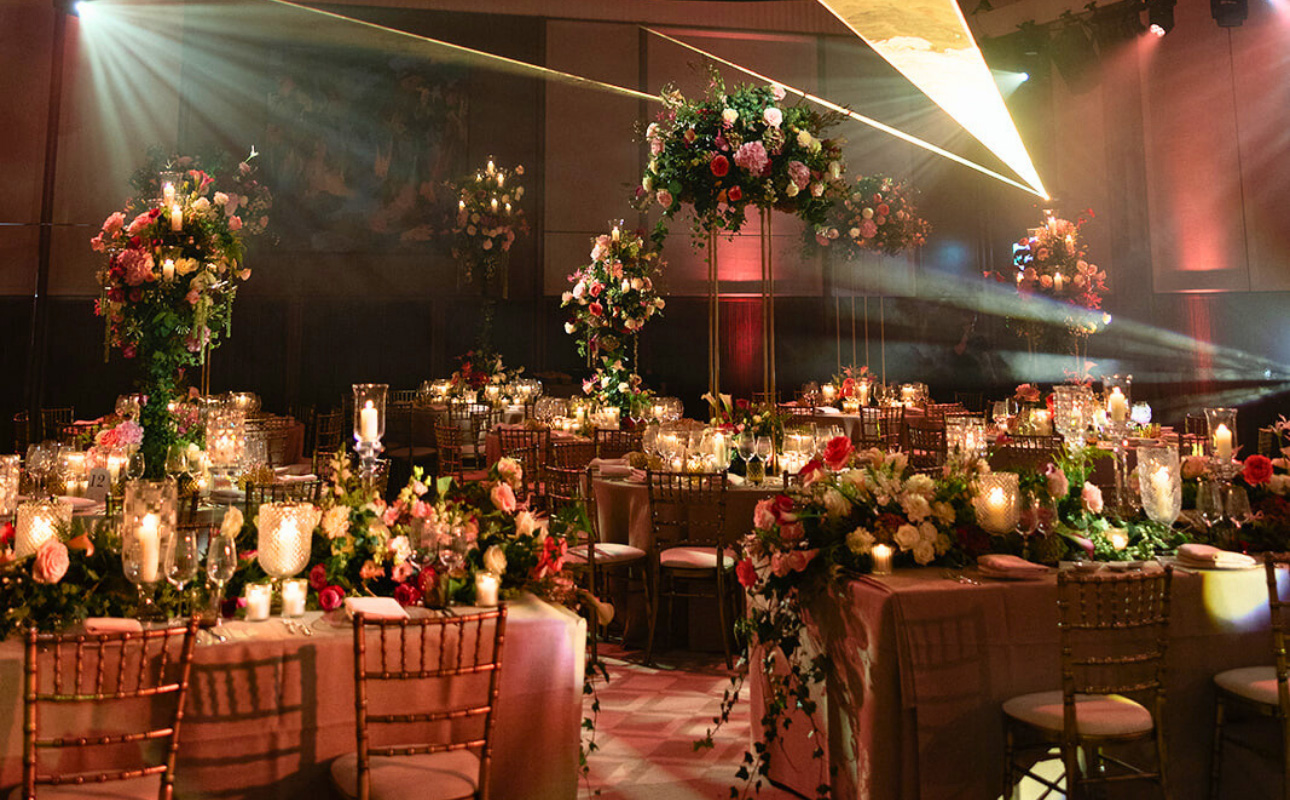 From dramatic floral installations that transformed the ballroom into a living artwork, to carefully designed lighting that shifted the mood across the evening, the scene was set not just for a wedding, but for an immersive experience.