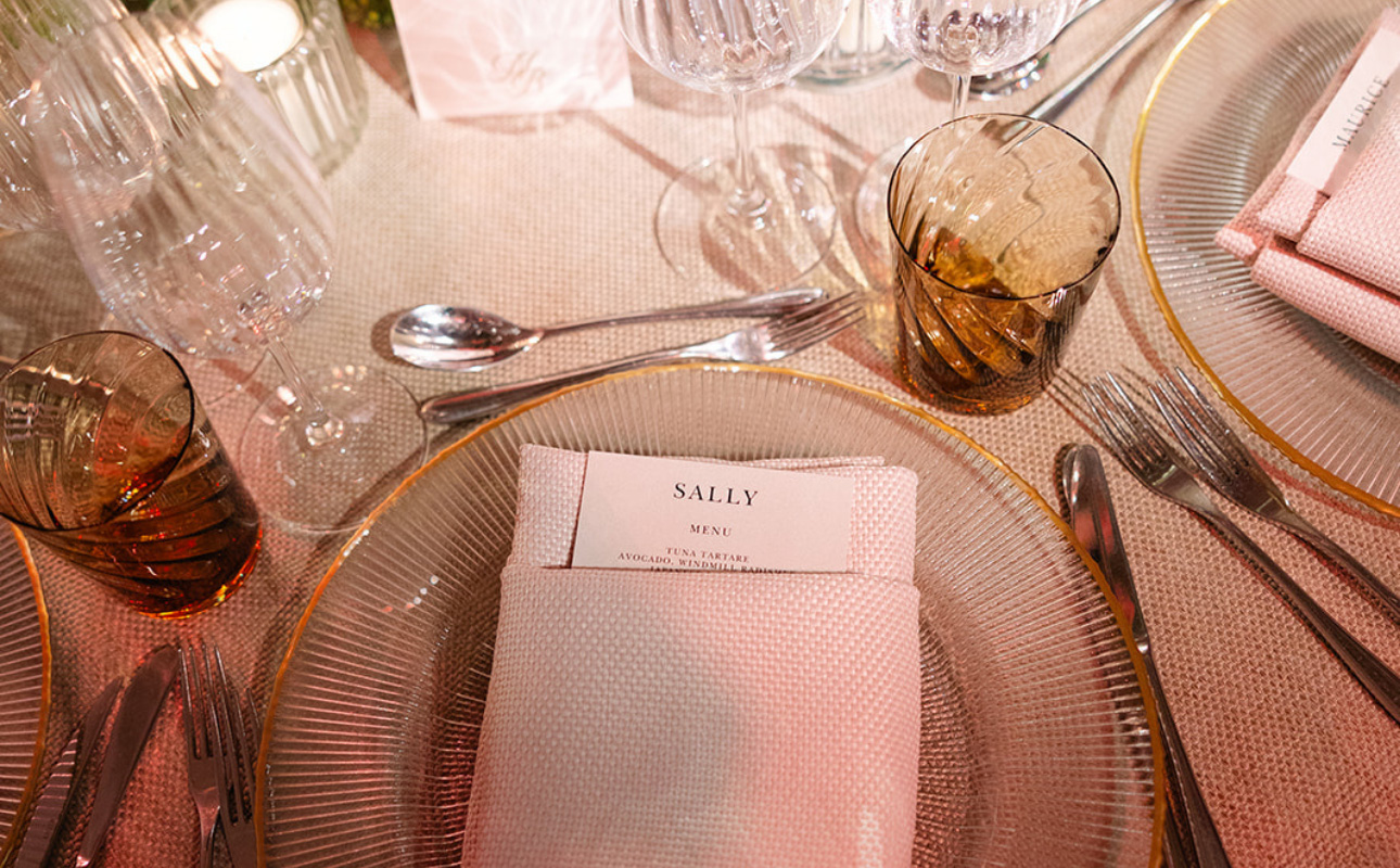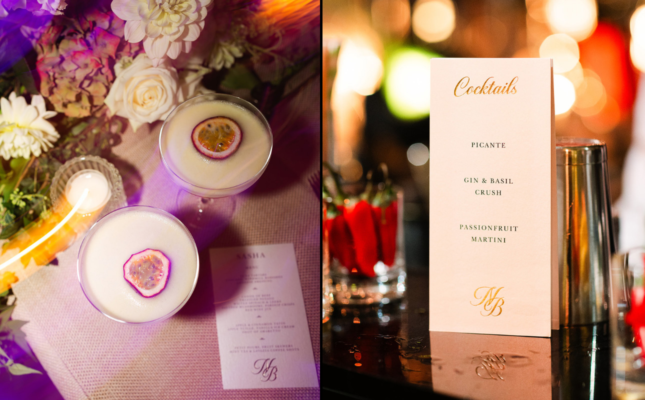 Every element of this wedding was chosen with intent. Guests were seated at the table with personalised menus that doubled as elegant name places. Signature cocktails — a Picante, Gin and Basil Crush, and a Passionfruit Martini — were designed to reflect the couple’s favourite flavours, turning the drinks menu into a glimpse of their shared tastes. Perfume bottles engraved with the wedding date became keepsakes of the day, both luxurious and meaningful.